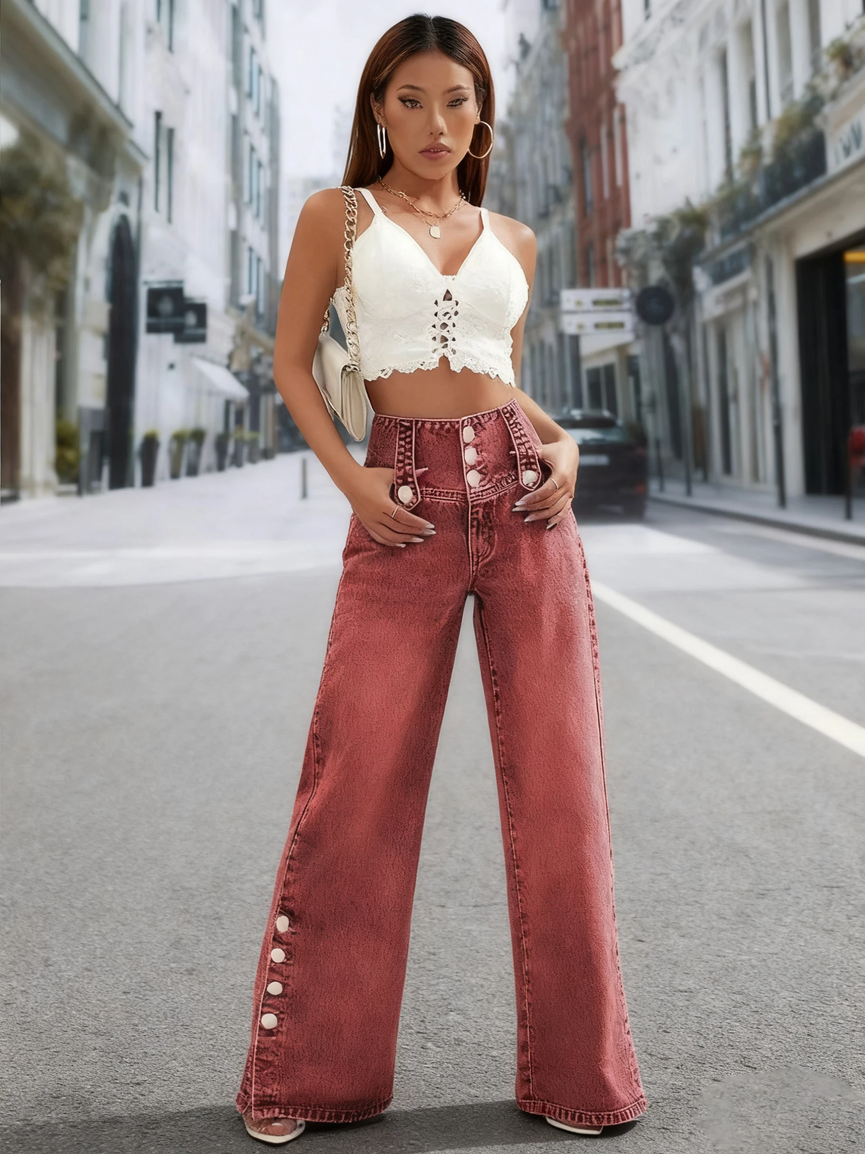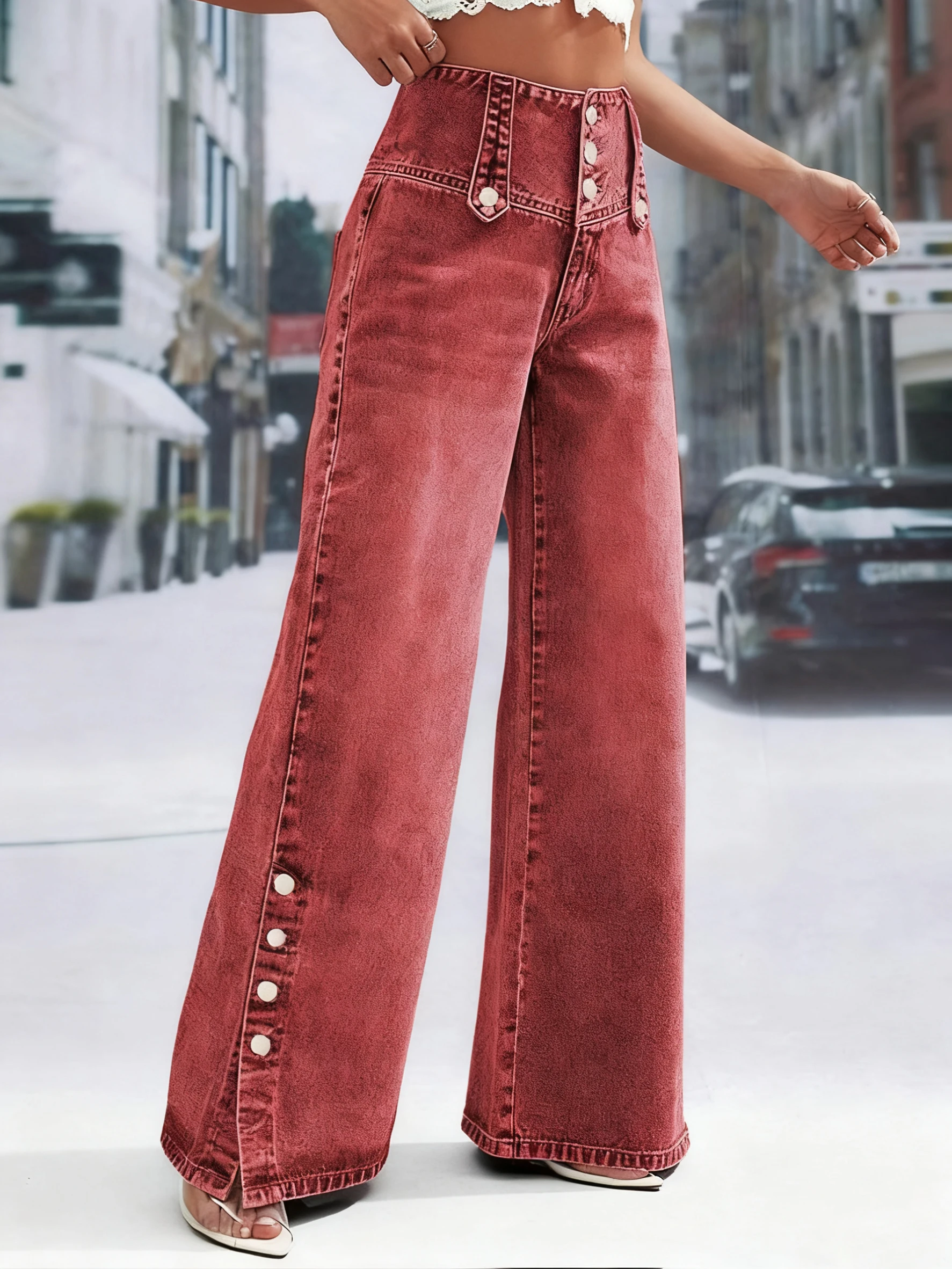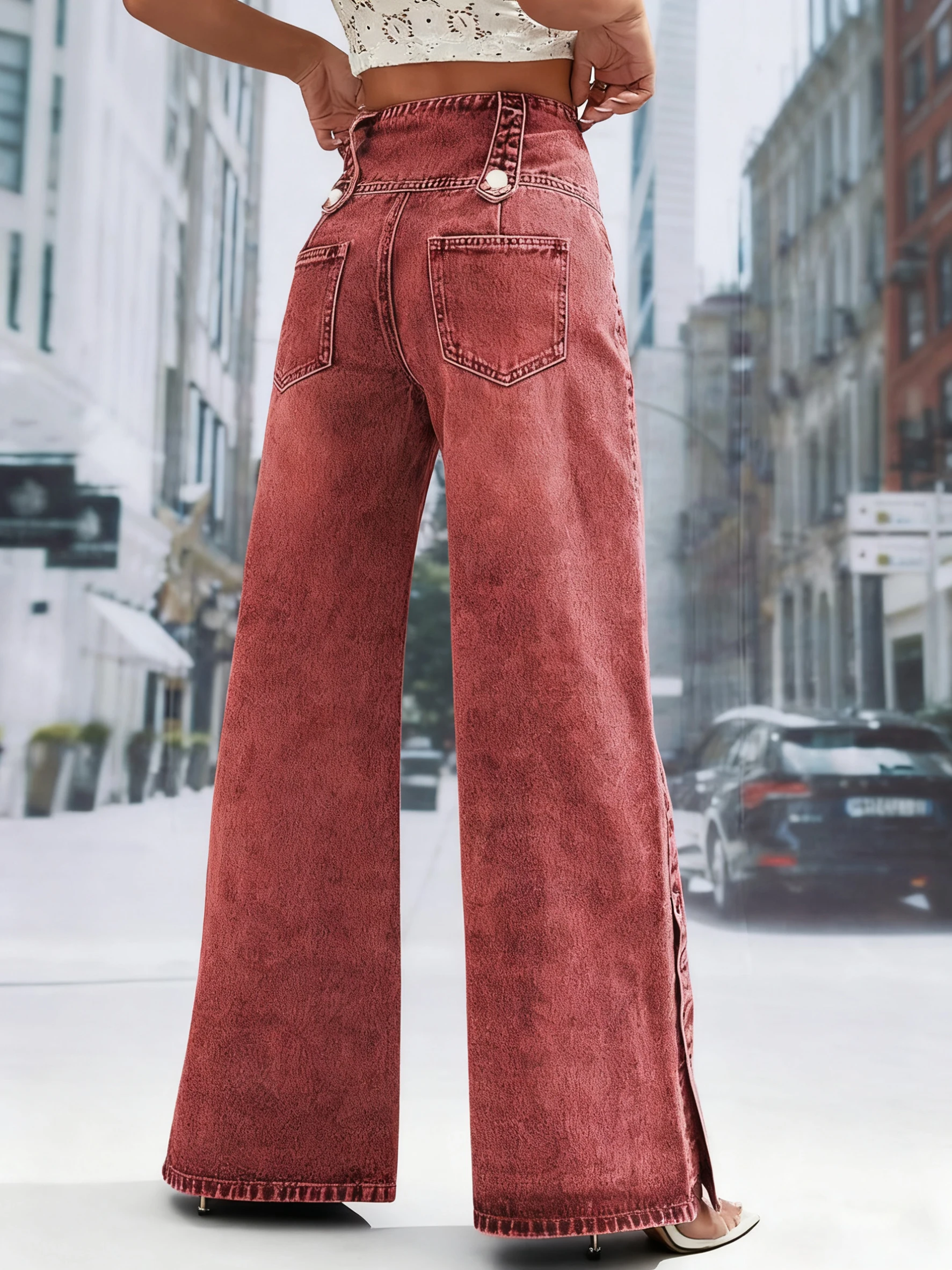 Red-brown denim trousers.